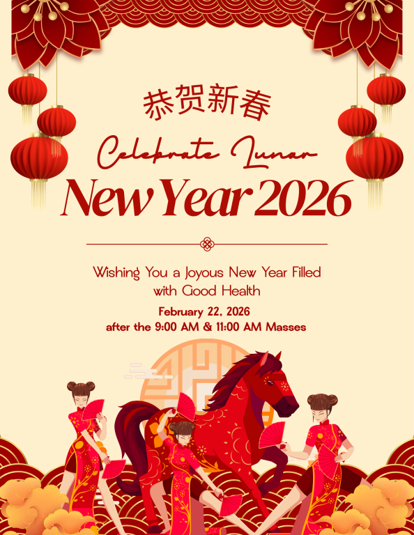 Hosted by the Parish Council in the Gathering Center, the celebration will feature snacks, treats, and informational displays highlighting how the Lunar New Year is celebrated across Asia.
